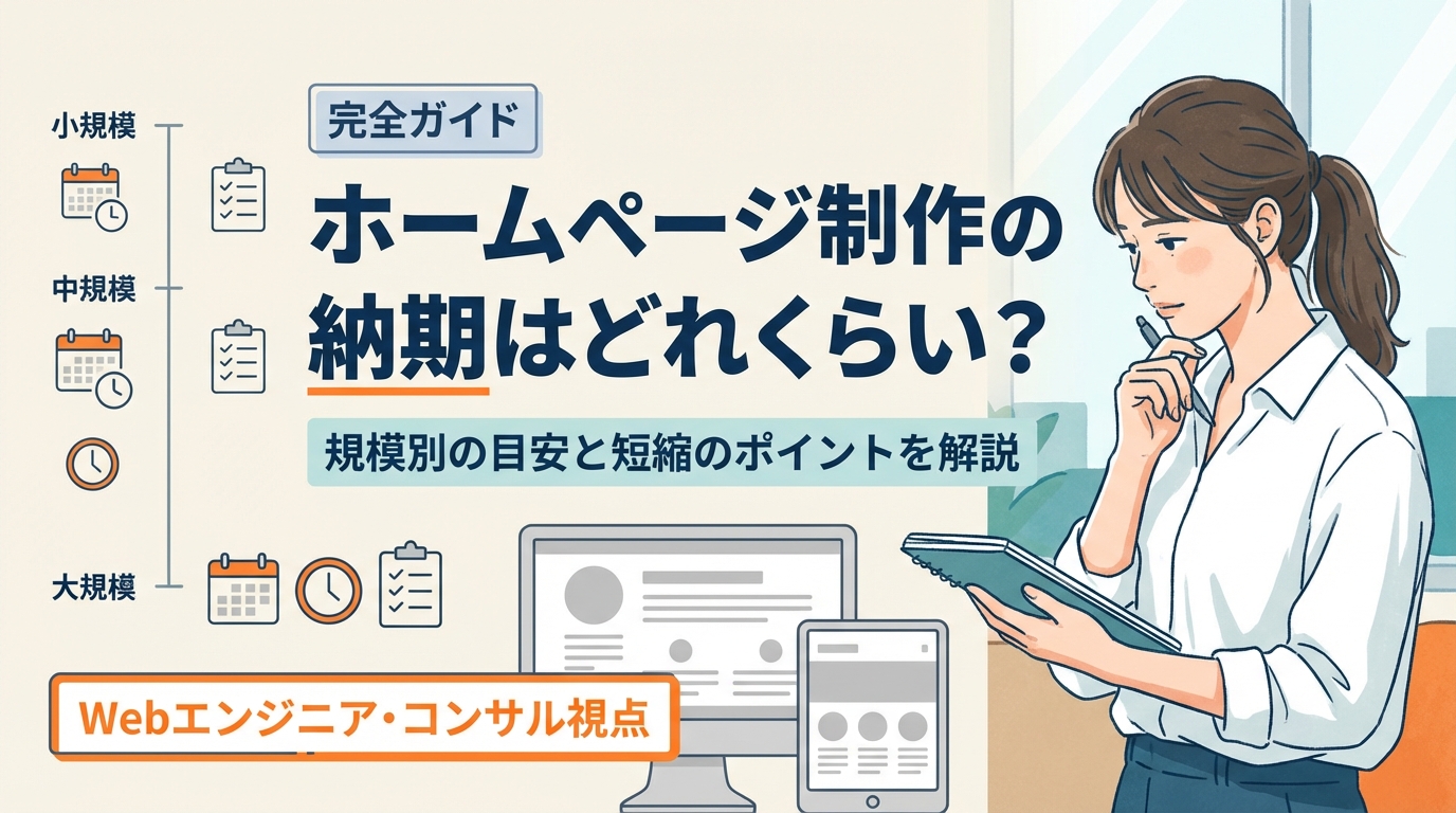 この記事では、ホームページ制作の一般的な納期の目安や、納期が変わる要因、早く制作するためのポイントについて、Webエンジニア・Webコンサルタントの視点から分かりやすく解説します。